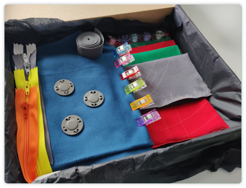 Iedomajies šo - jūsu ideja glīdi iepakota kastītē, kurā ir iepiekš precīzi piegrieztas apgērba detaļas no jūsu izvēlētā auduma. Katra detaļa ir ir marķēta ar visām šuvju līnijām un nepieciešamajām atzīmēm. Tāpat arī atbilstoši diegi un visi apgērbam nepieciešamie piederumi jau ir iekļauti. Ņemot vērā, cik viss ir pārdomāti organizēts, Jums atliek tikai gremdēties šūšanas priekā šujot savu nākamo šedevru un izbaudīt tā valkāšanu.